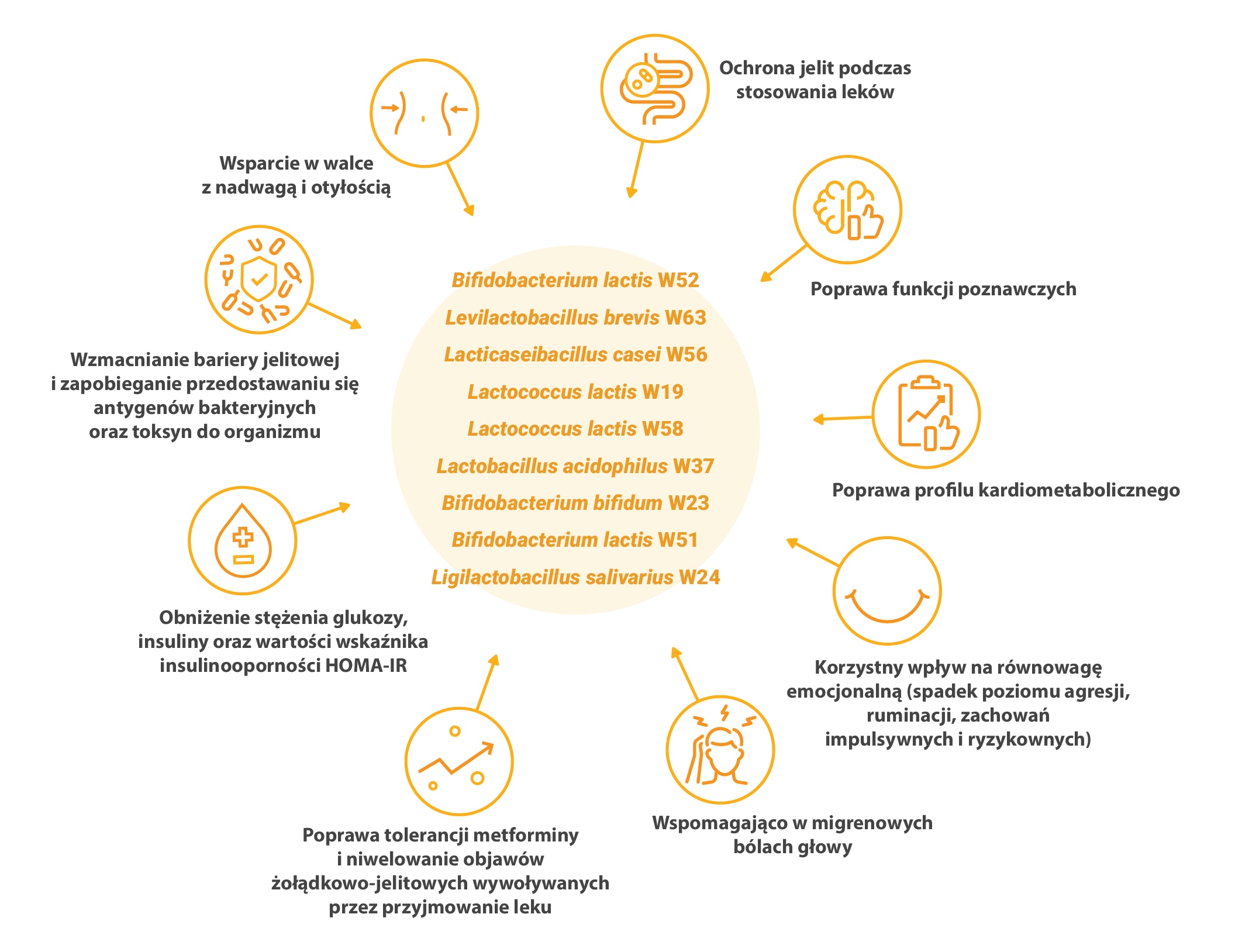 Bifidobacterium lactis W52 jest znany z korzystnego wpływu na gospodarkę glukozowo-insulinową i zdrowie metaboliczne. W badaniach z udziałem osób z cukrzycą typu 2 wykazano, że mieszanka zawierająca ten szczep poprawiała wrażliwość komórek na insulinę oraz zmniejszała poziom markerów stanu zapalnego. To niezwykle korzystne działanie w przebiegu leczenia insulinooporności i zmniejszania ryzyka wystąpienia cukrzycy typu 2.