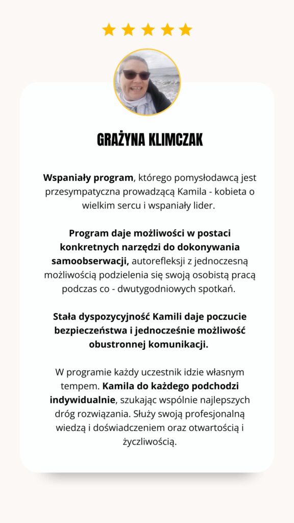 Prywatnie uważam się za osobę uwielbiającą rozwiązania „po środku”, nie lubiącą skrajności. W pracy z ludźmi stawiam na ich dobrostan psychiczny, elastyczność i wolność, indywidualne podeście i pracę na zasobach.